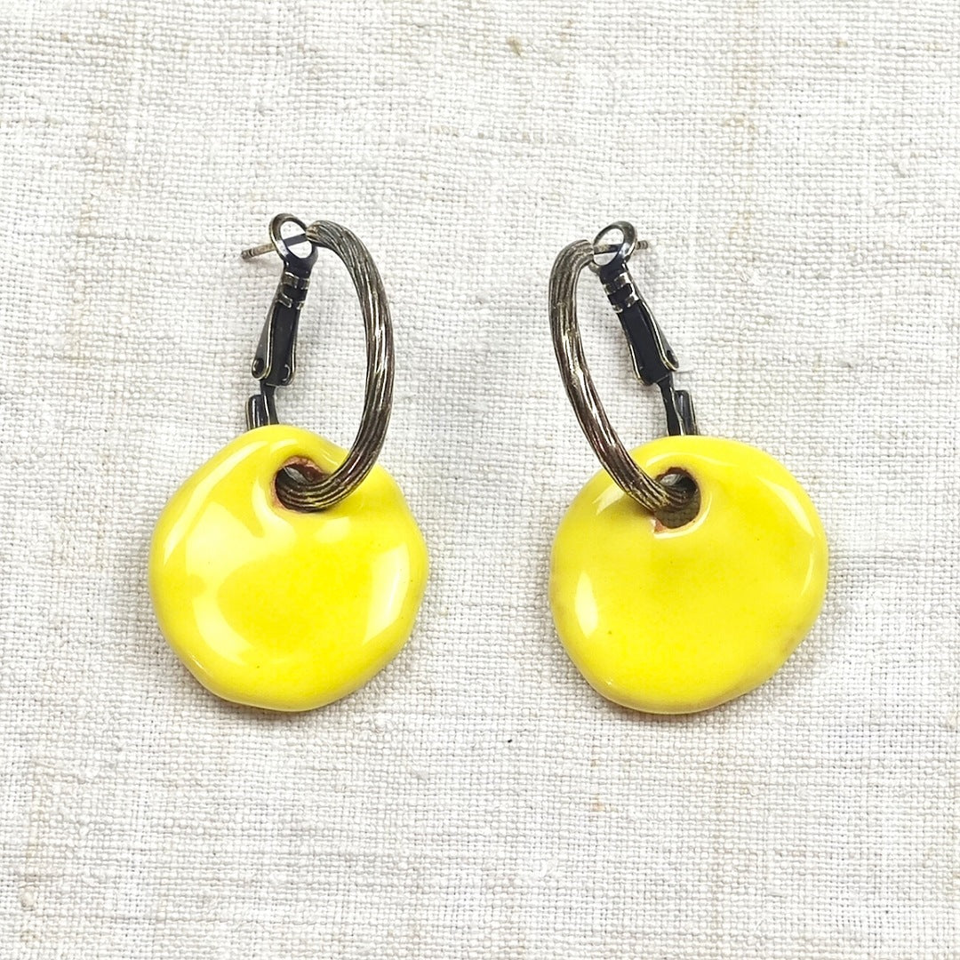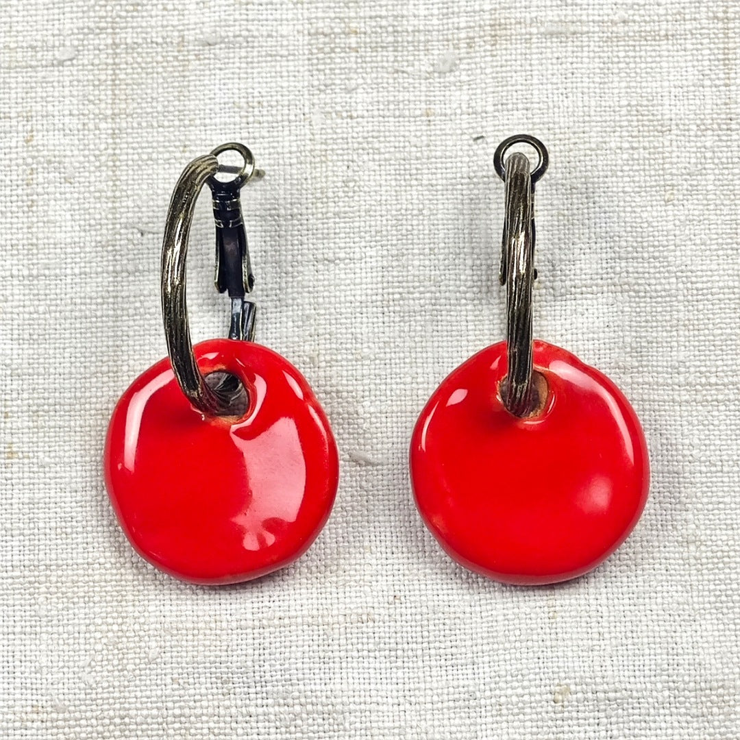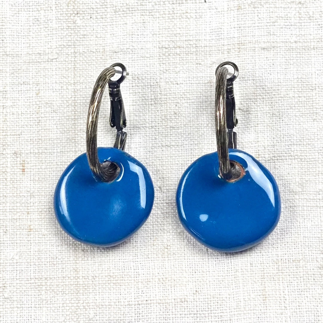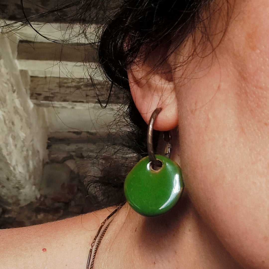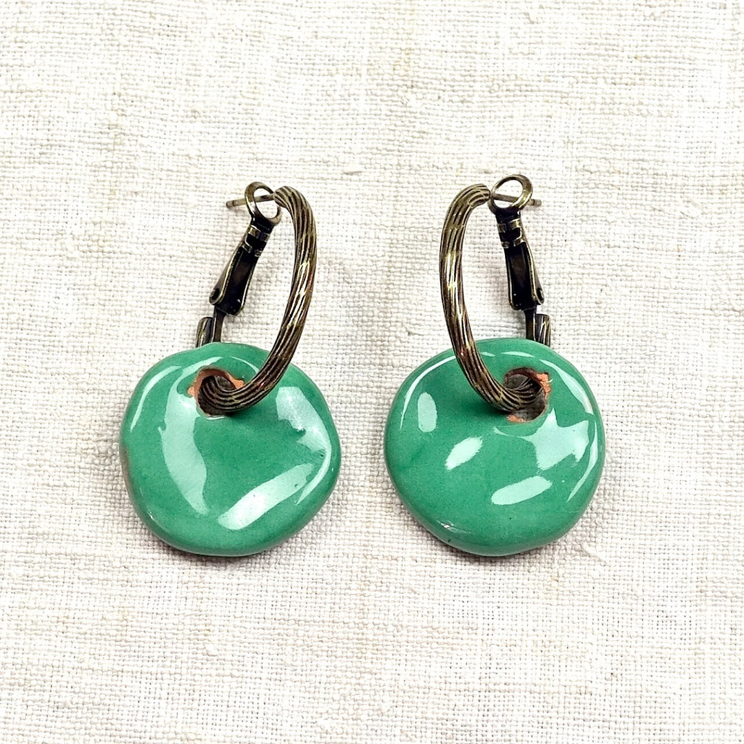 Orecchini composti da una gilda ovale ritorta in ottone antico nichel free e una pastiglia di ceramica modellata e smaltata a mano. Gli orecchini misurano cm 4,5 circa. La pastiglia ha un diametro di circa cm 3. Essento fatti a mano potrebbero leggermente variare nella forma e nelle dimensioni.