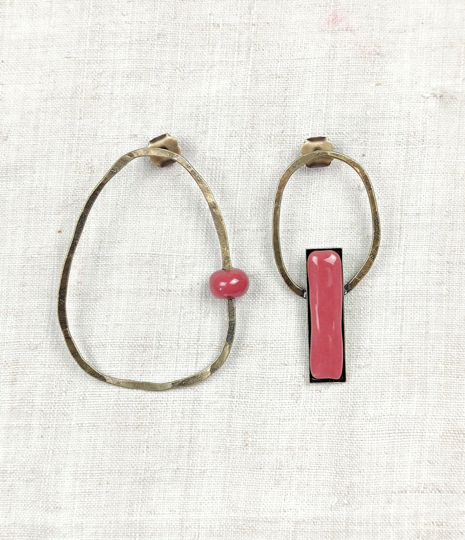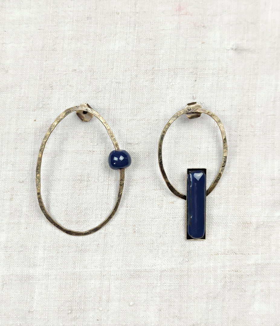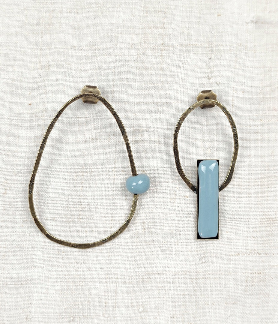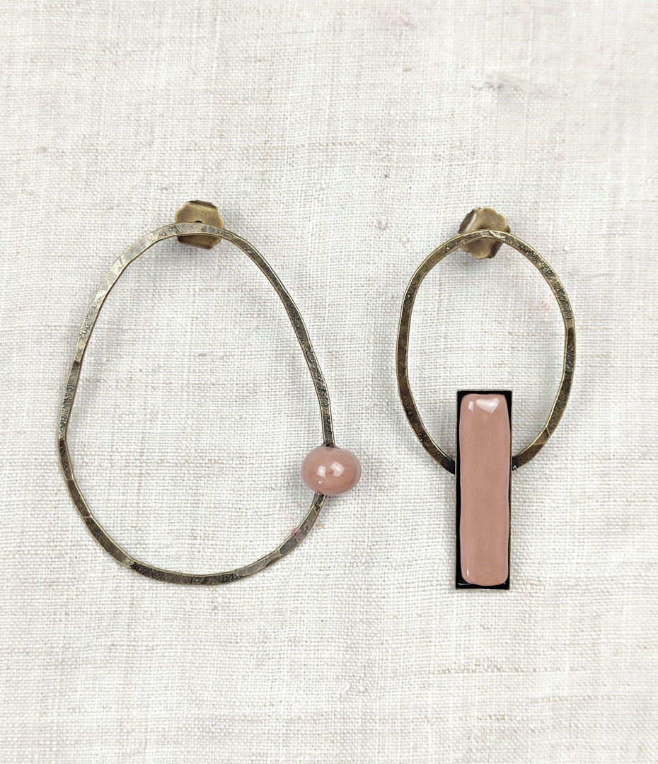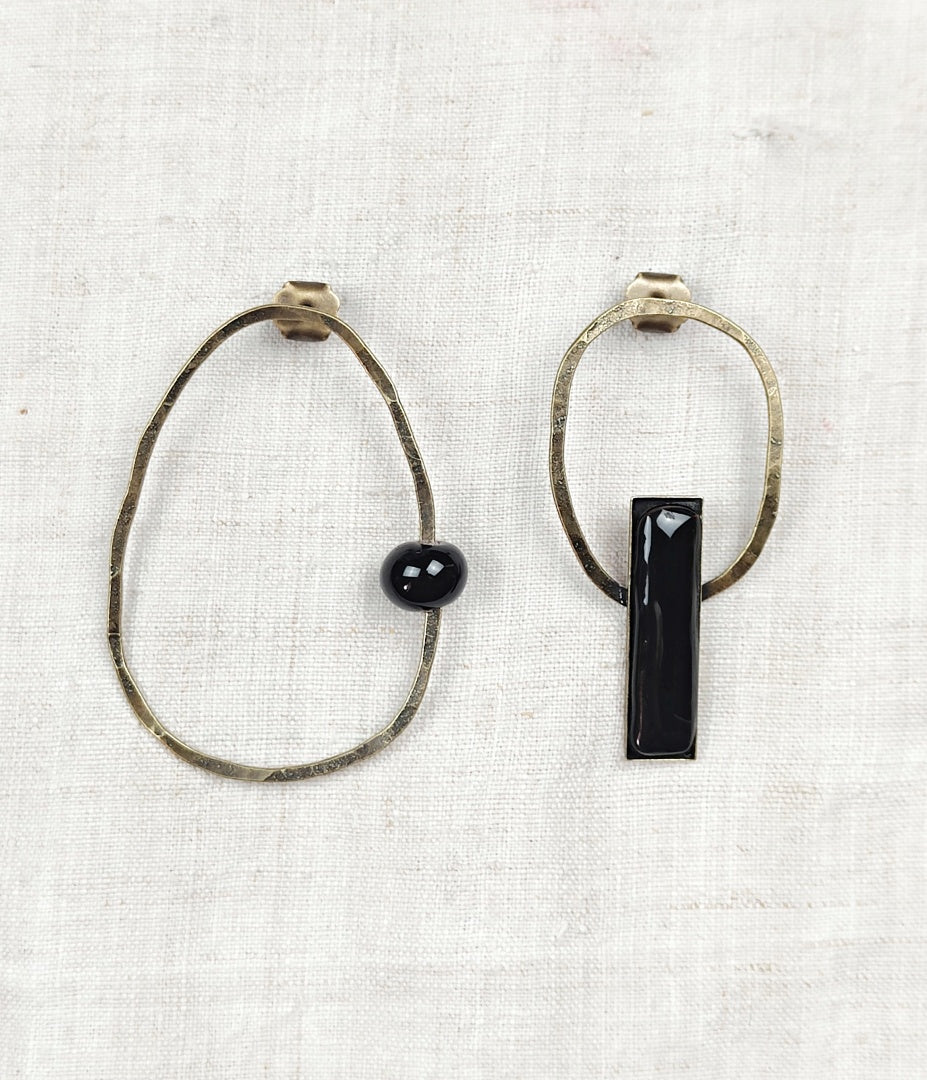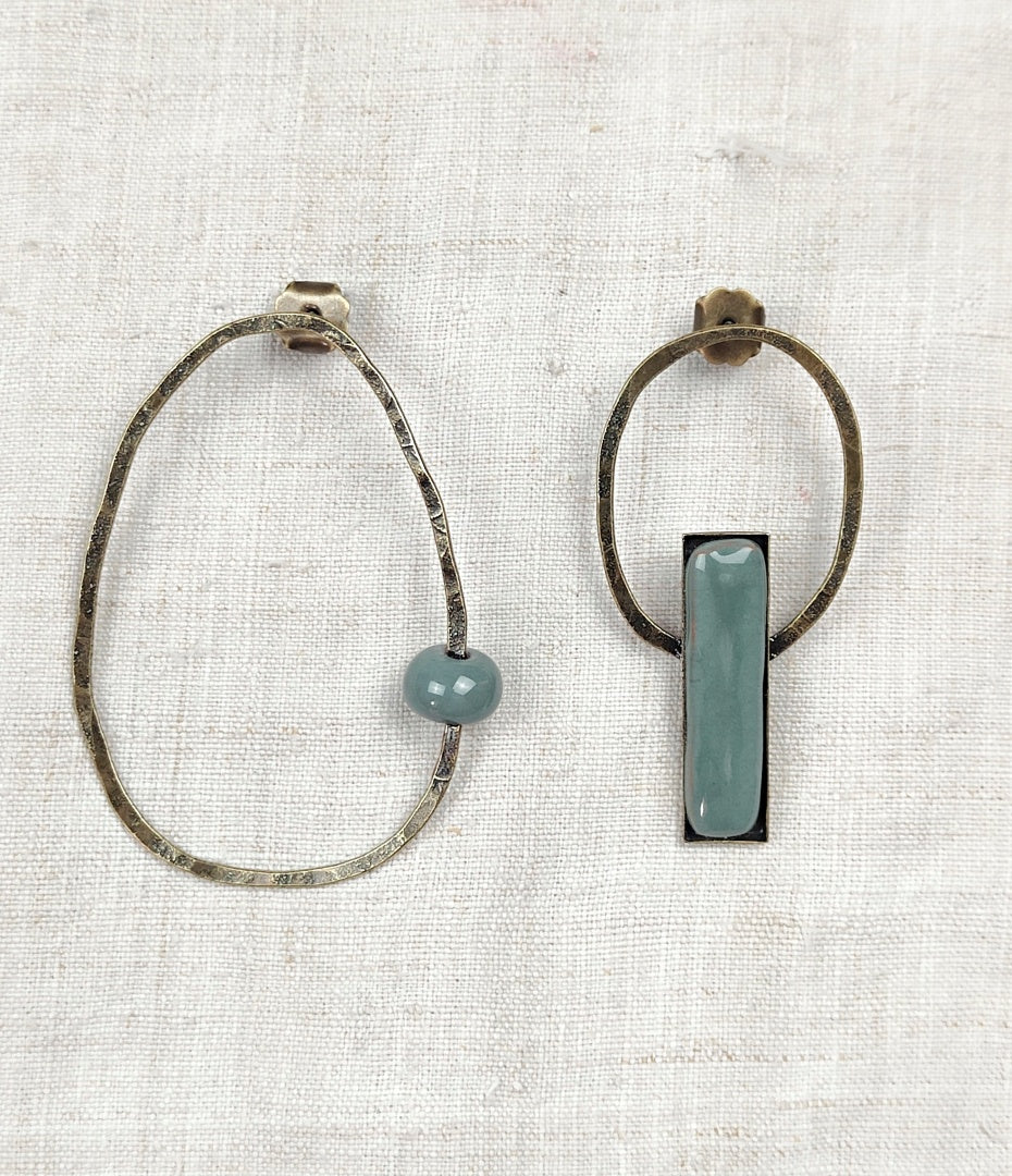 orecchini asimmetrici con perno , composti da due cerchi in ottone martellato, uno più piccolo con un castone rettangolare e l'altro più grande con una boule in ceramica abbinata. sono lunghi circa cm 6,5 con una larghezza di circa cm 4,5 per l'elemento più grande e cm 3,5 per quello più piccolo. Il trattamento galvanico è in ottone antico senza nichel.