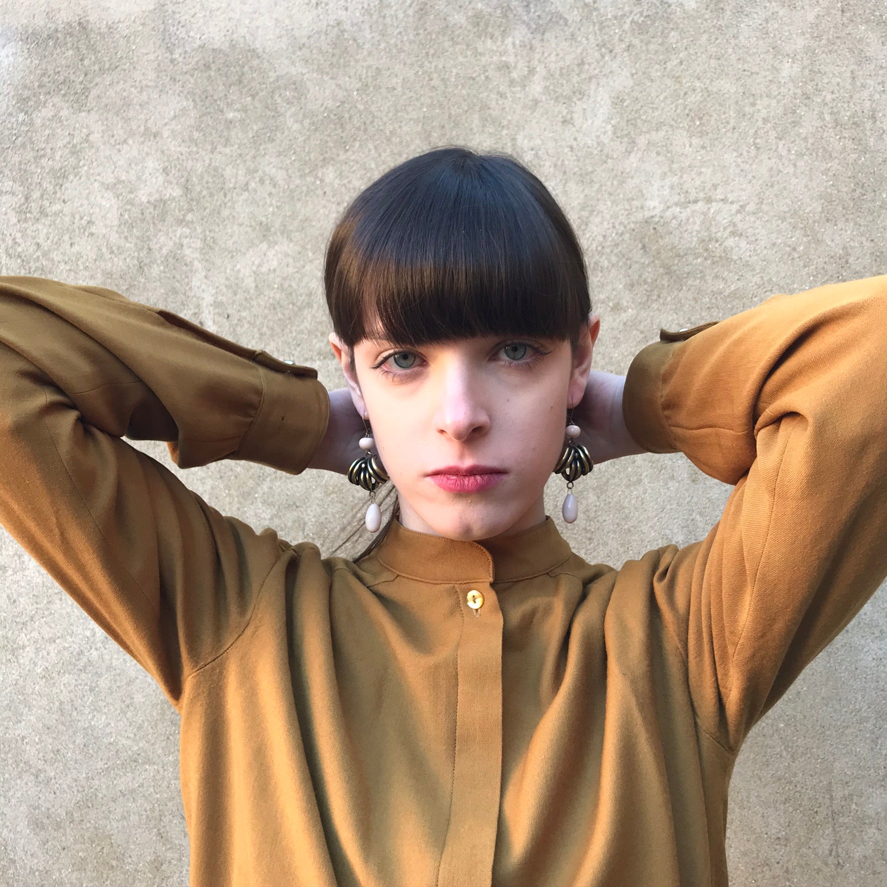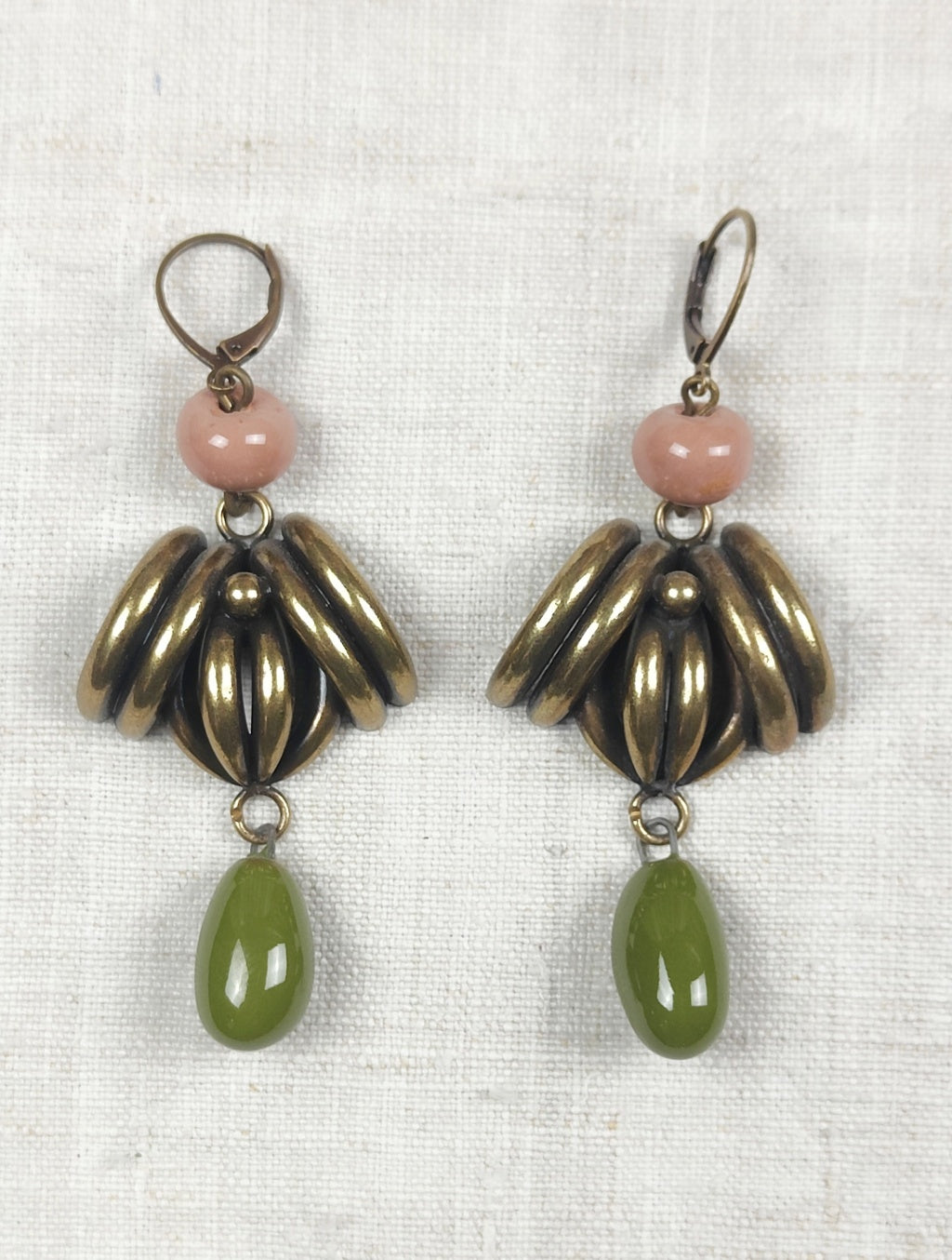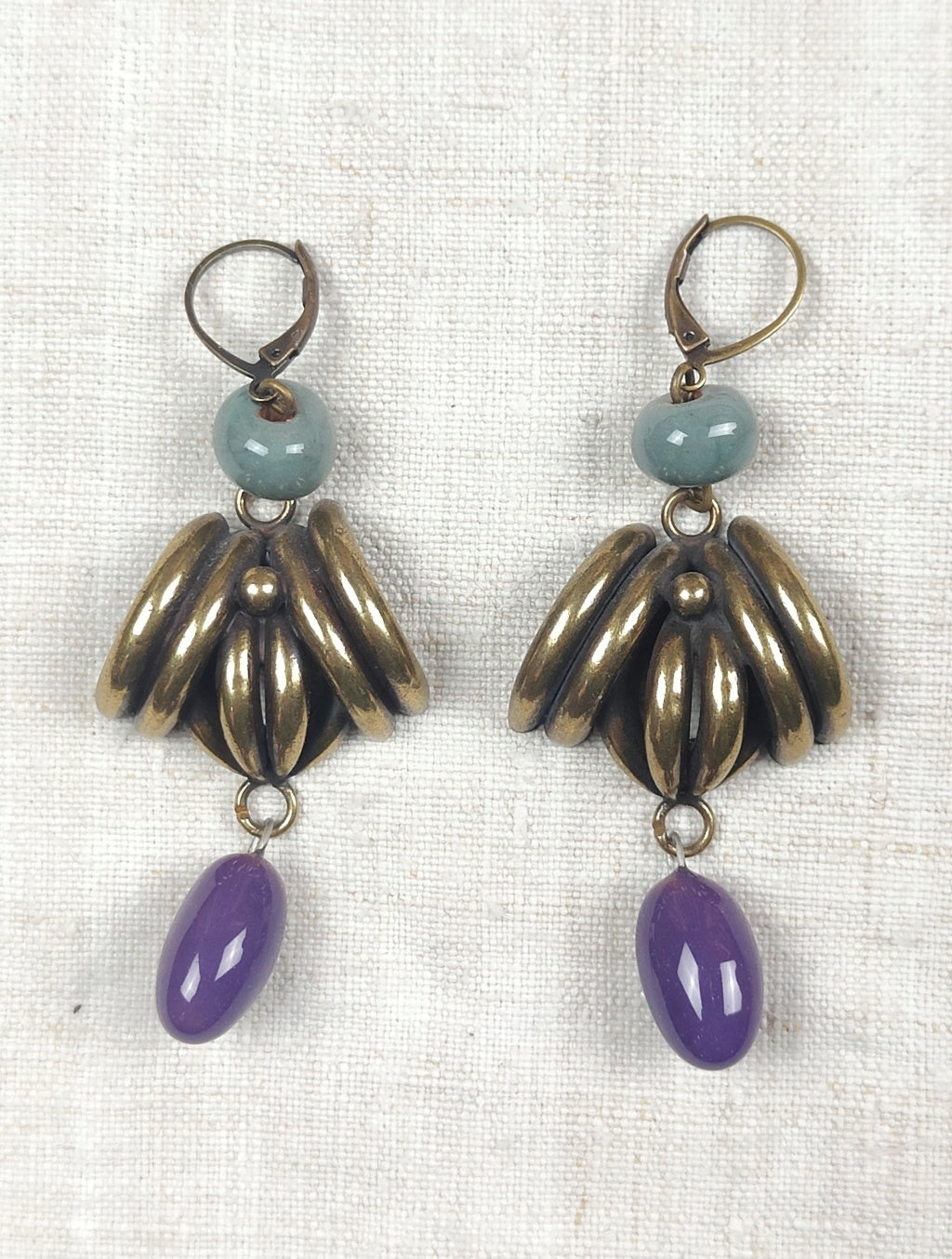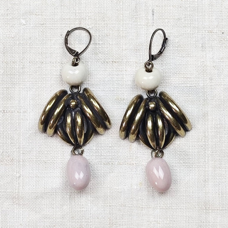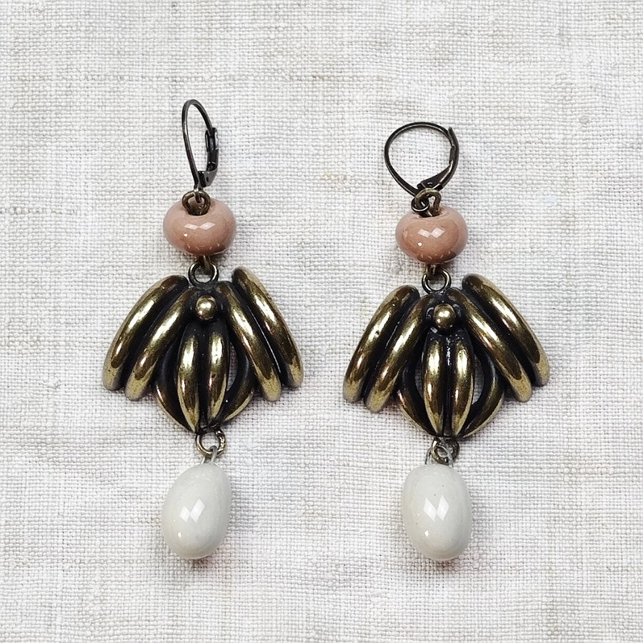 Orecchini composti da un elemento in ottone dal sapore decò con boule e goccia in ceramica modellata e smaltata artigianalmente. L'orecchino misura cm 7,5