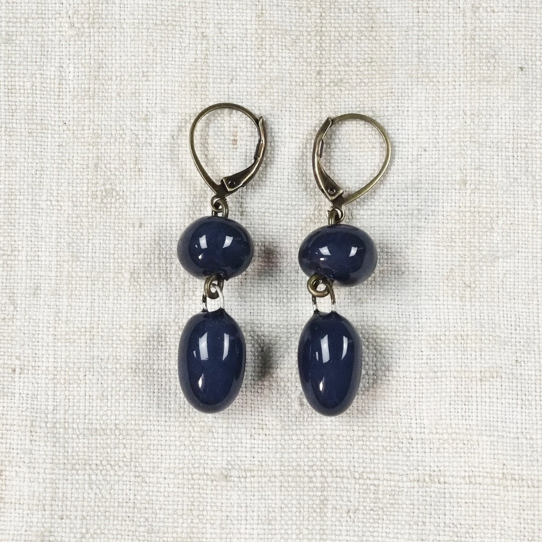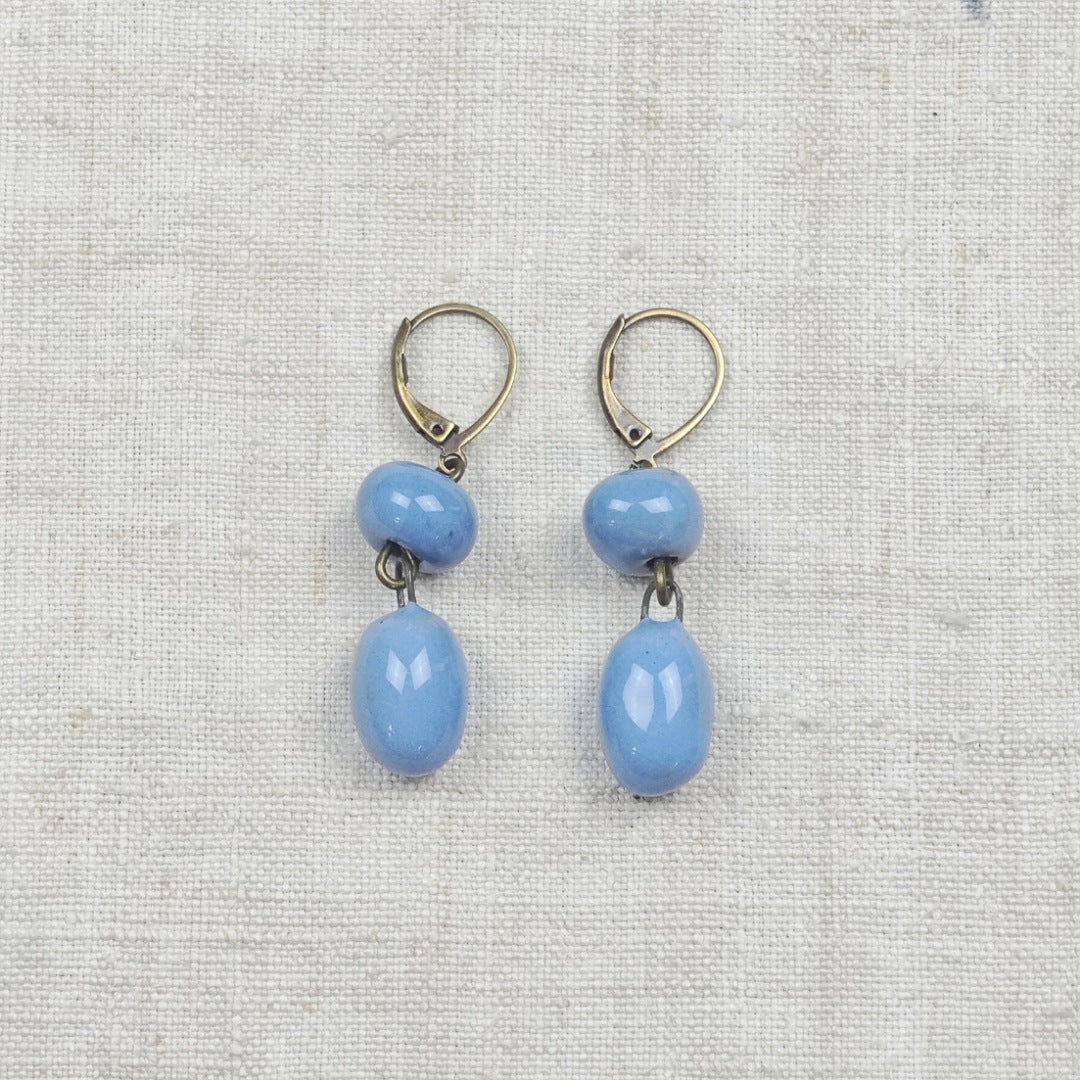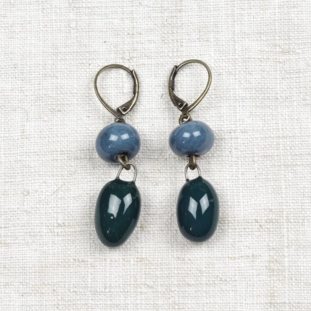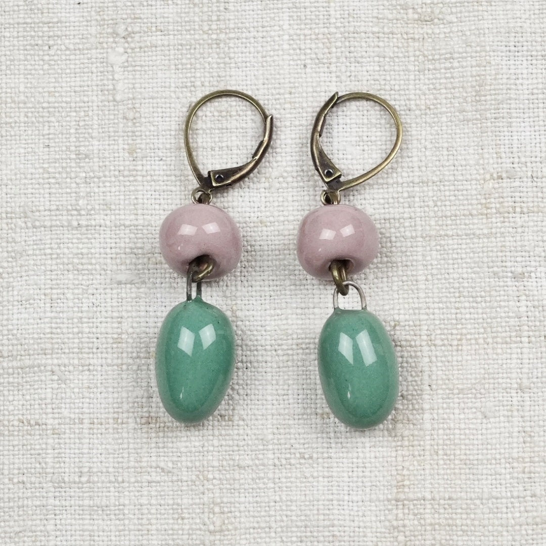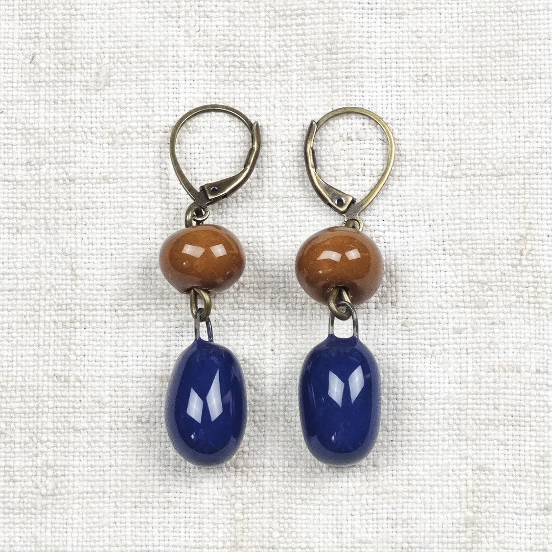 Orecchini a goccia formati da una sfera e una goccia in ceramica smaltata e modellata a mano. La monachella è in ottone senza niche. Misura cm 4,5.