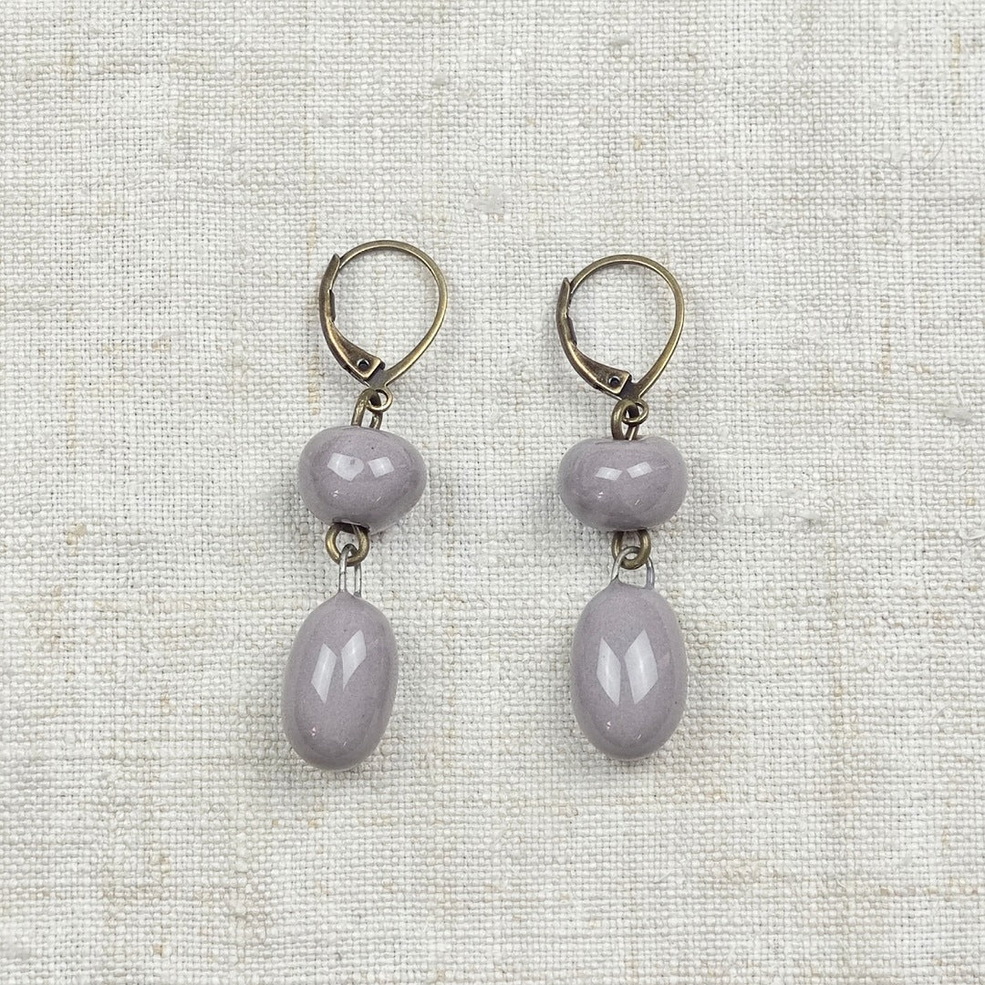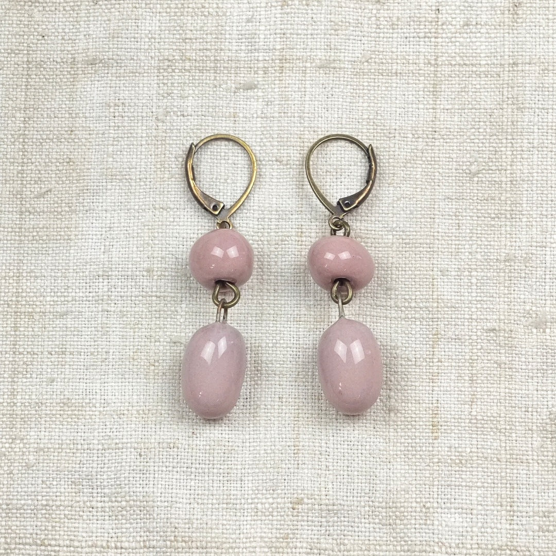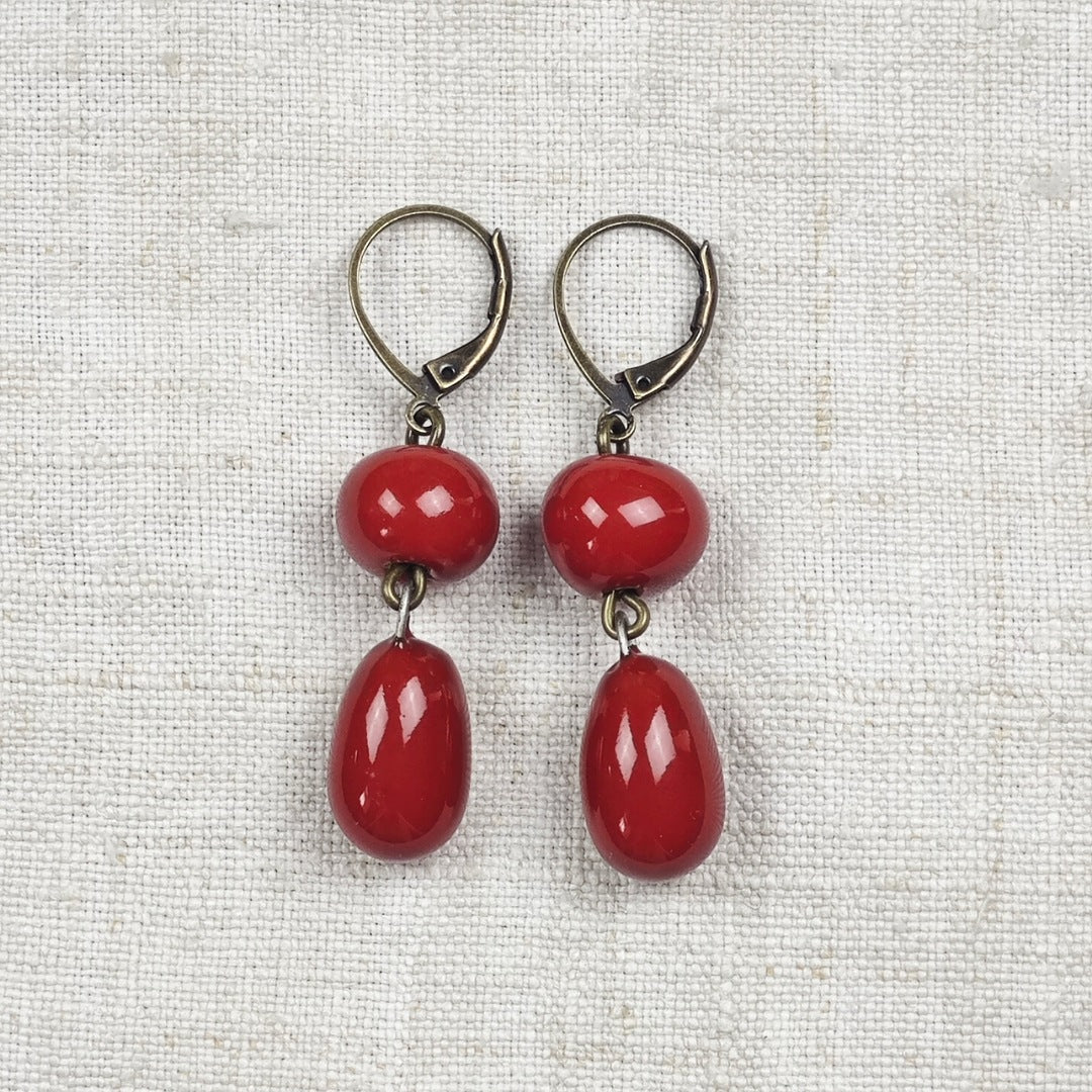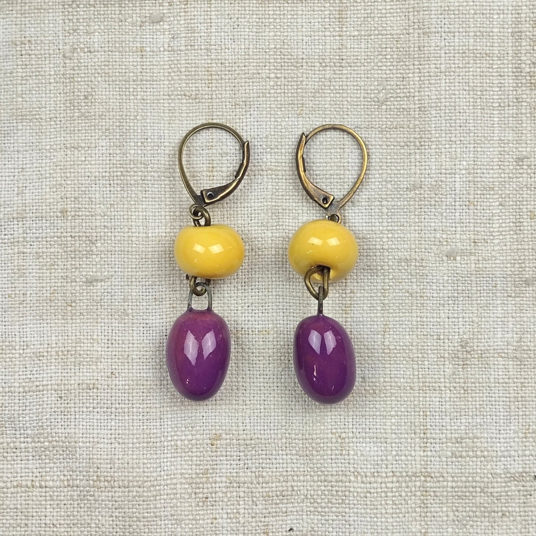 Orecchini a goccia formati da una sfera e una goccia in ceramica smaltata e modellata a mano. La monachella è in ottone senza niche. Misura cm 4,5.
