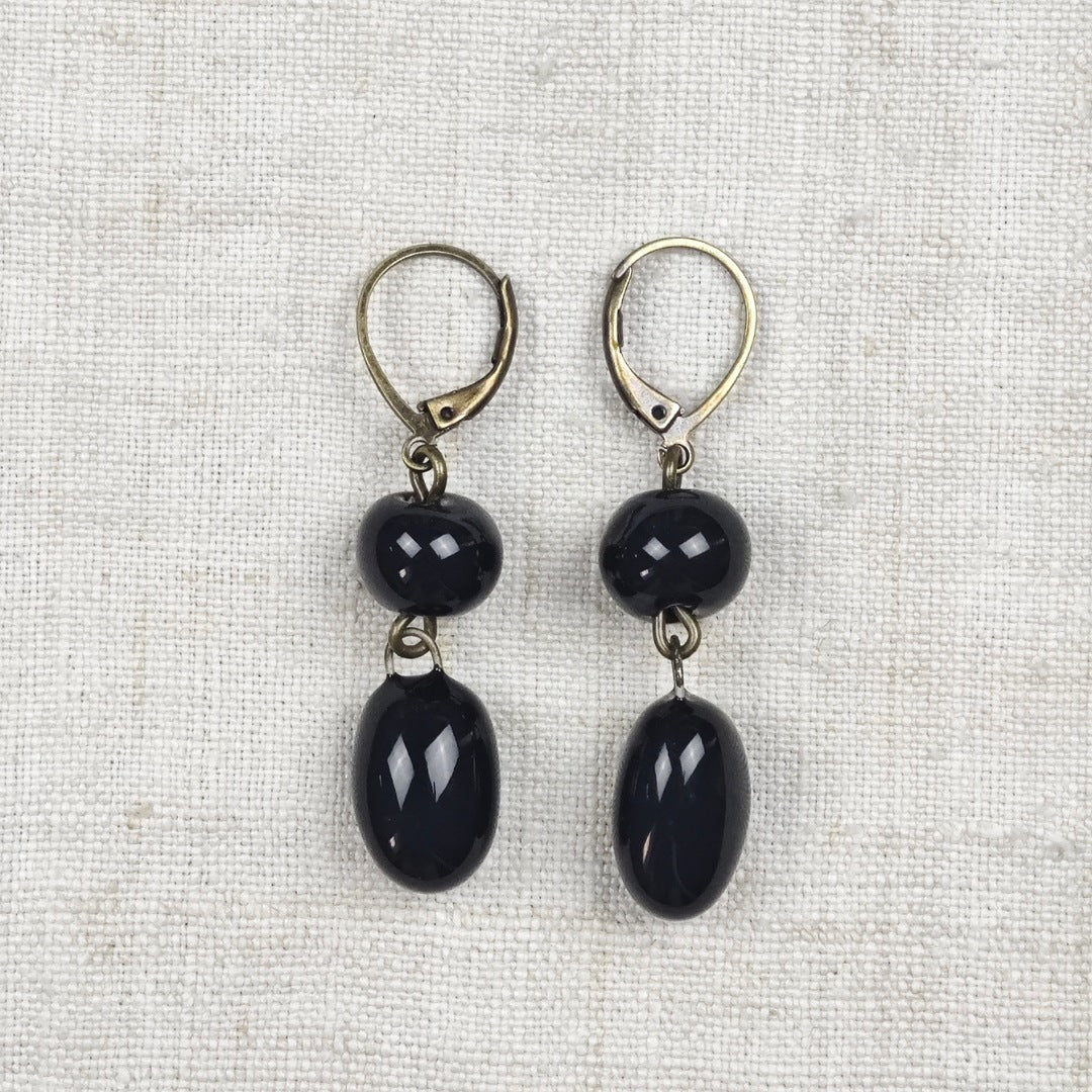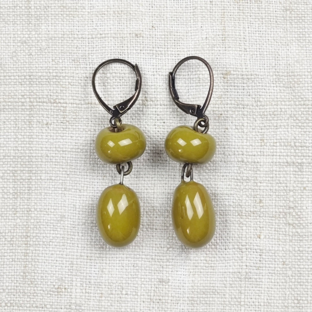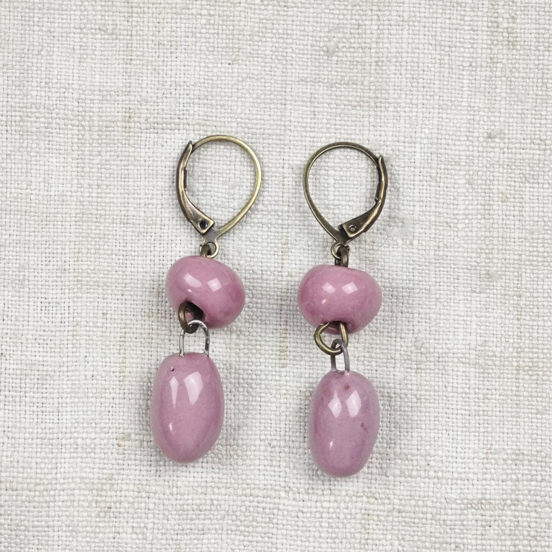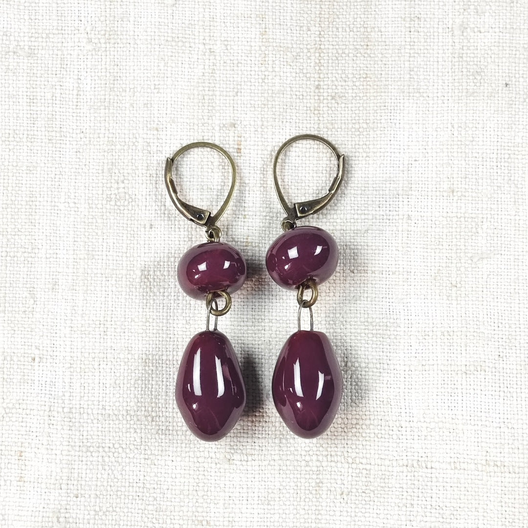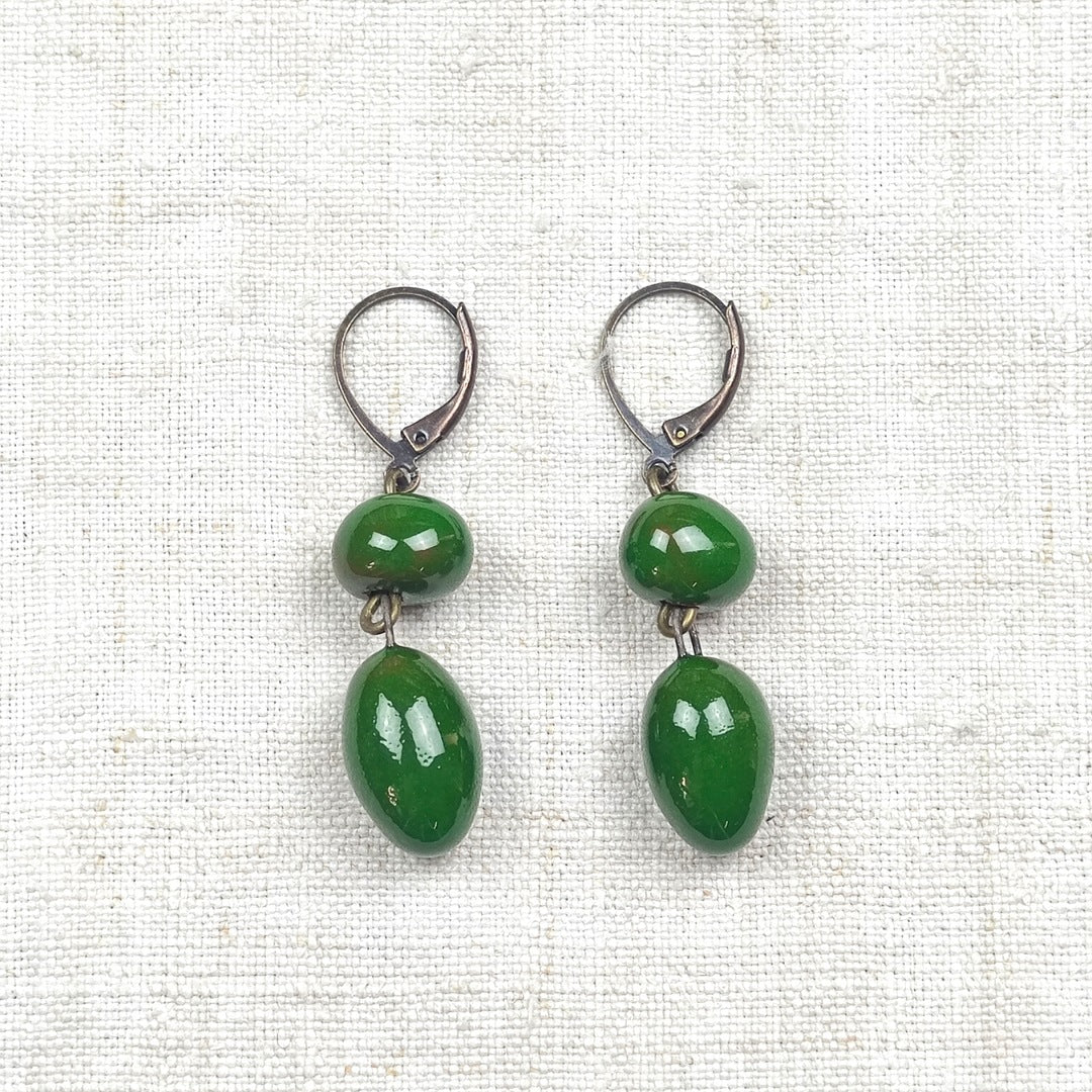 Orecchini a goccia formati da una sfera e una goccia in ceramica smaltata e modellata a mano. La monachella è in ottone senza niche. Misura cm 4,5.