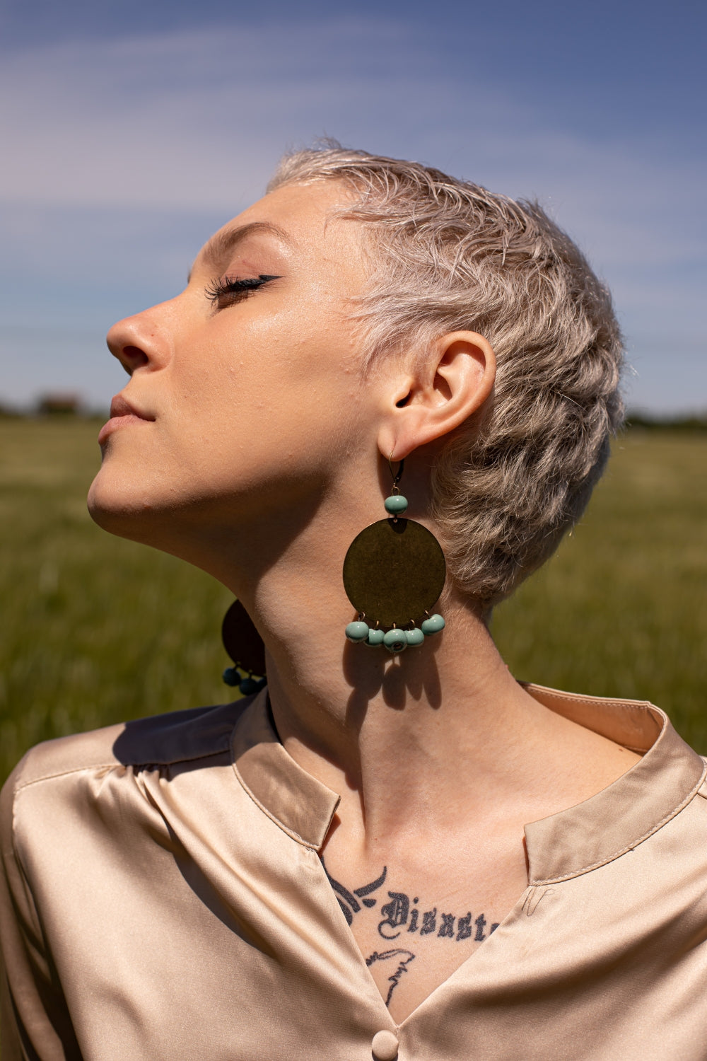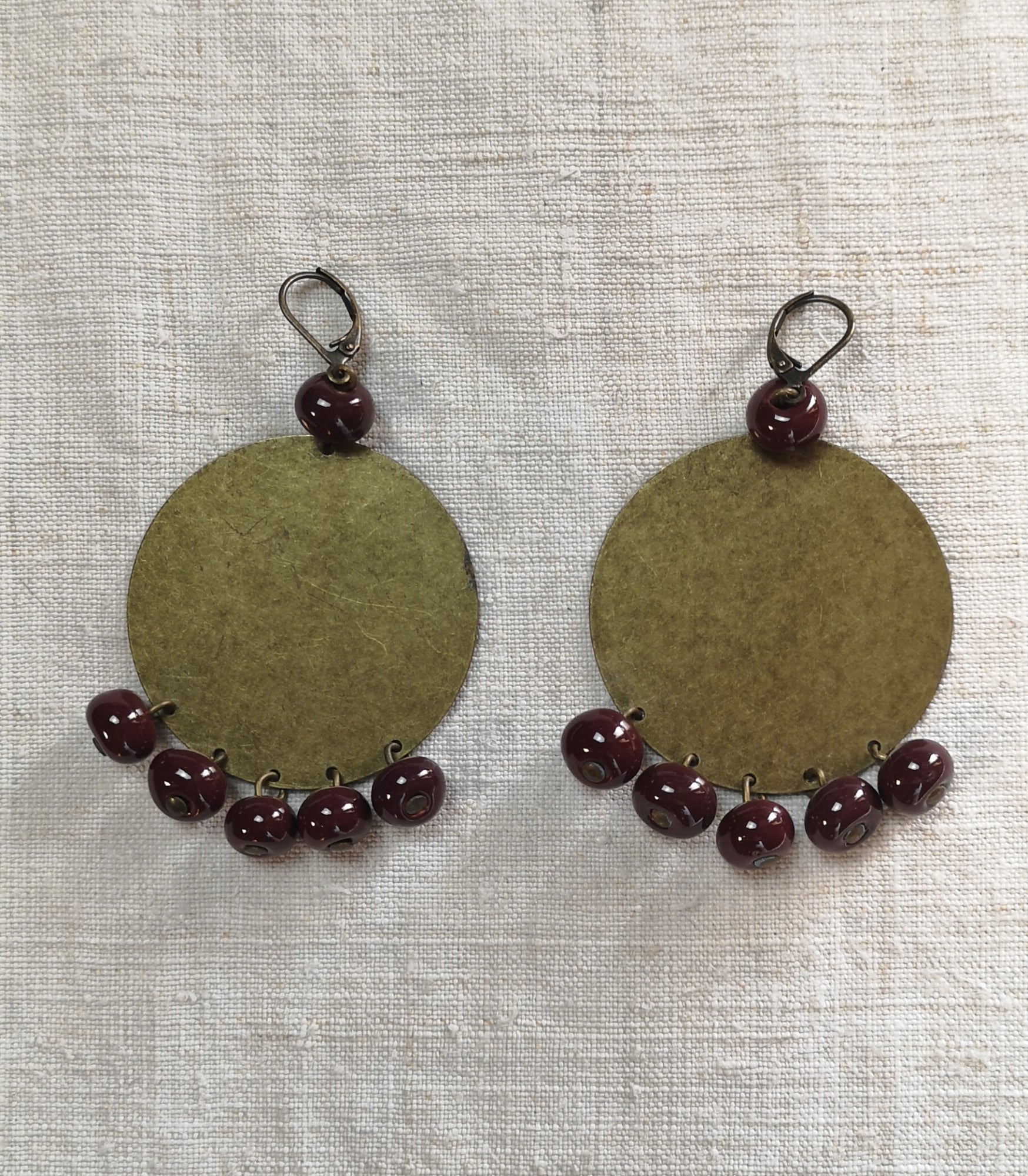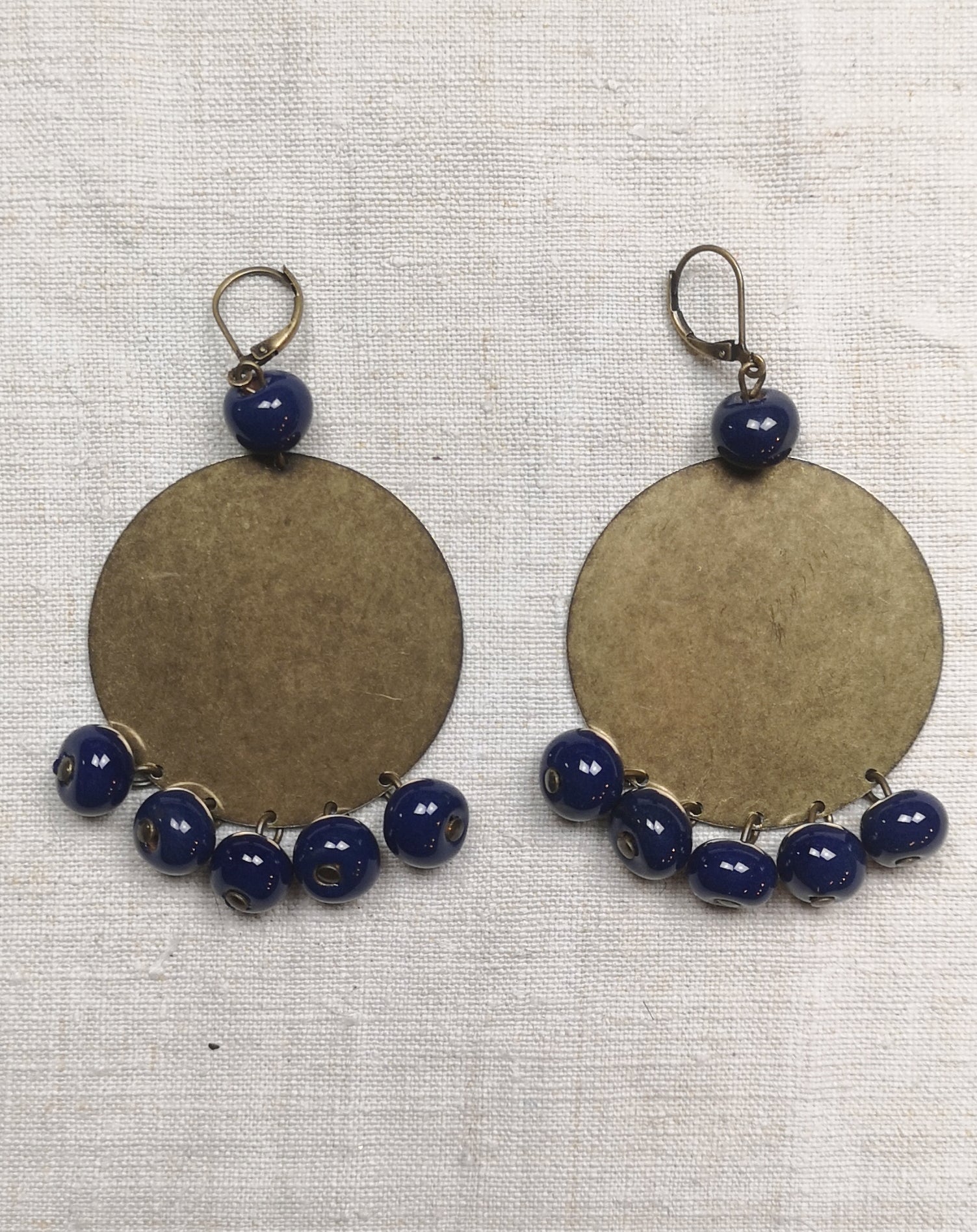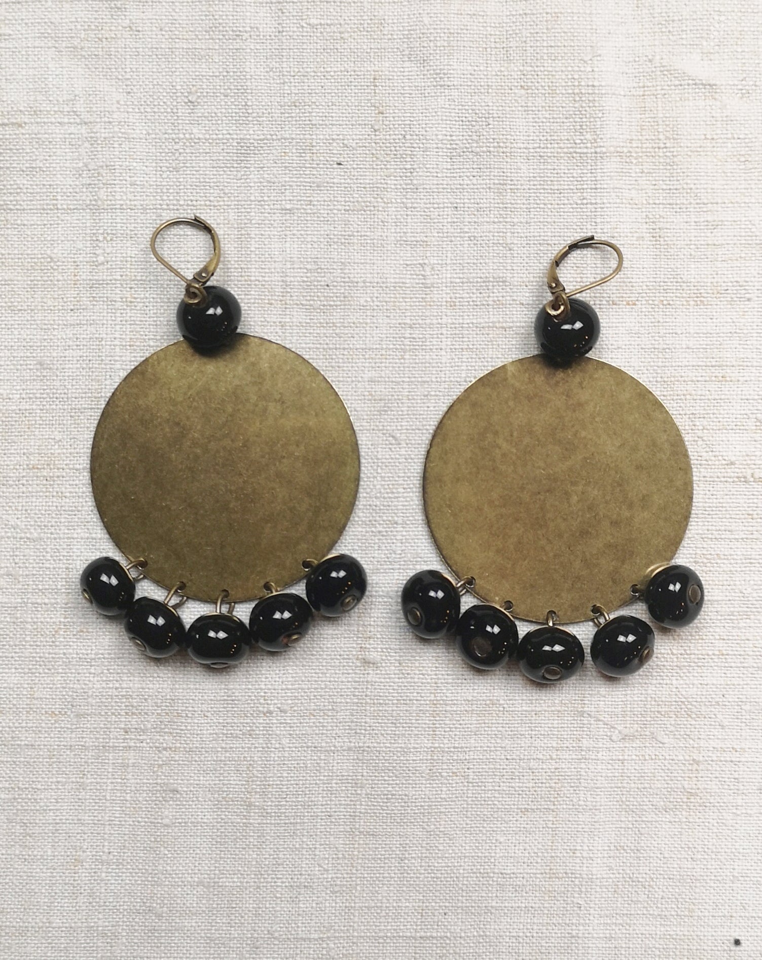 Orecchini composti da un disco in ottone invecchiato senza nichel e 6 boules in ceramica modellate e smaltate a mano.