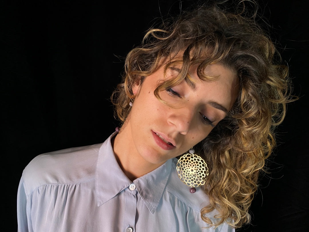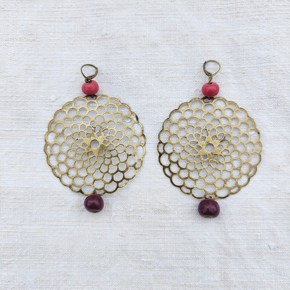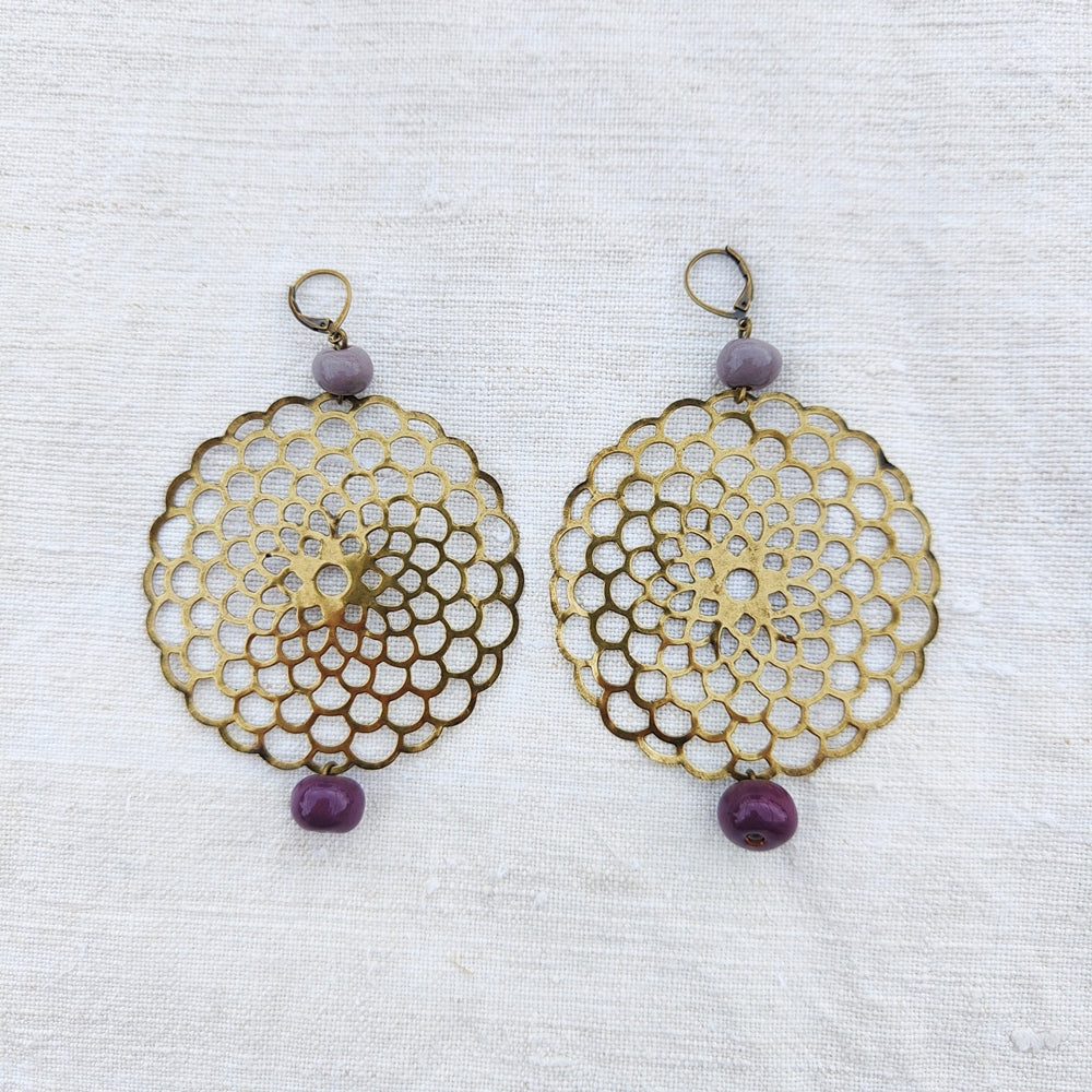 Orecchino bicolore composto da una filigrana di cm 6,5 di diametro in ottone invecchiato senza nichel e boules in ceramica bicolore modellate e smaltate a mano.
