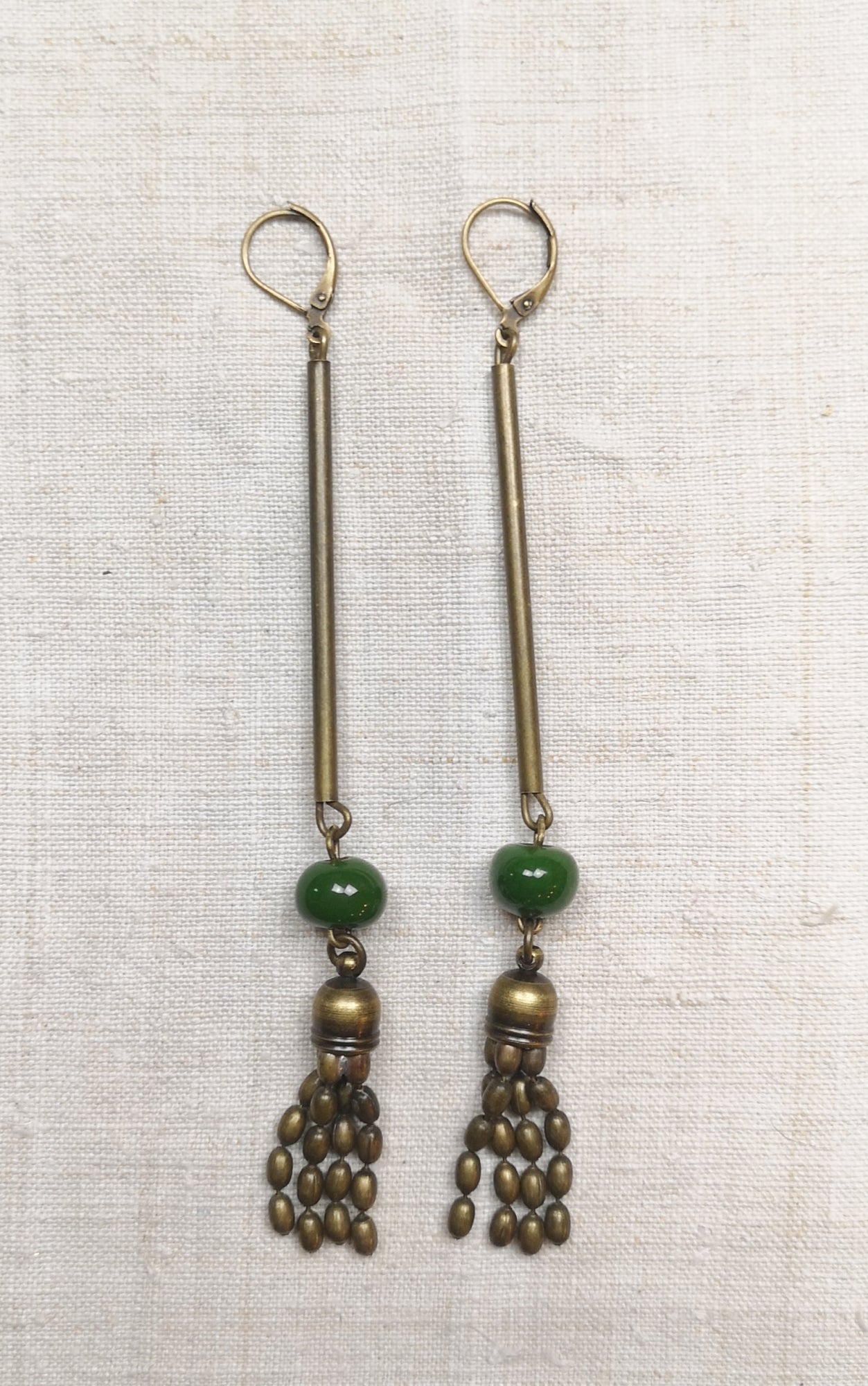 orecchini lunghi composti da un tubicino di ottone ,una boule in ceramica modellata e smaltata manualmente e una nappina in ottone. La lunghezza totale dell'orecchino è di cm 11.5