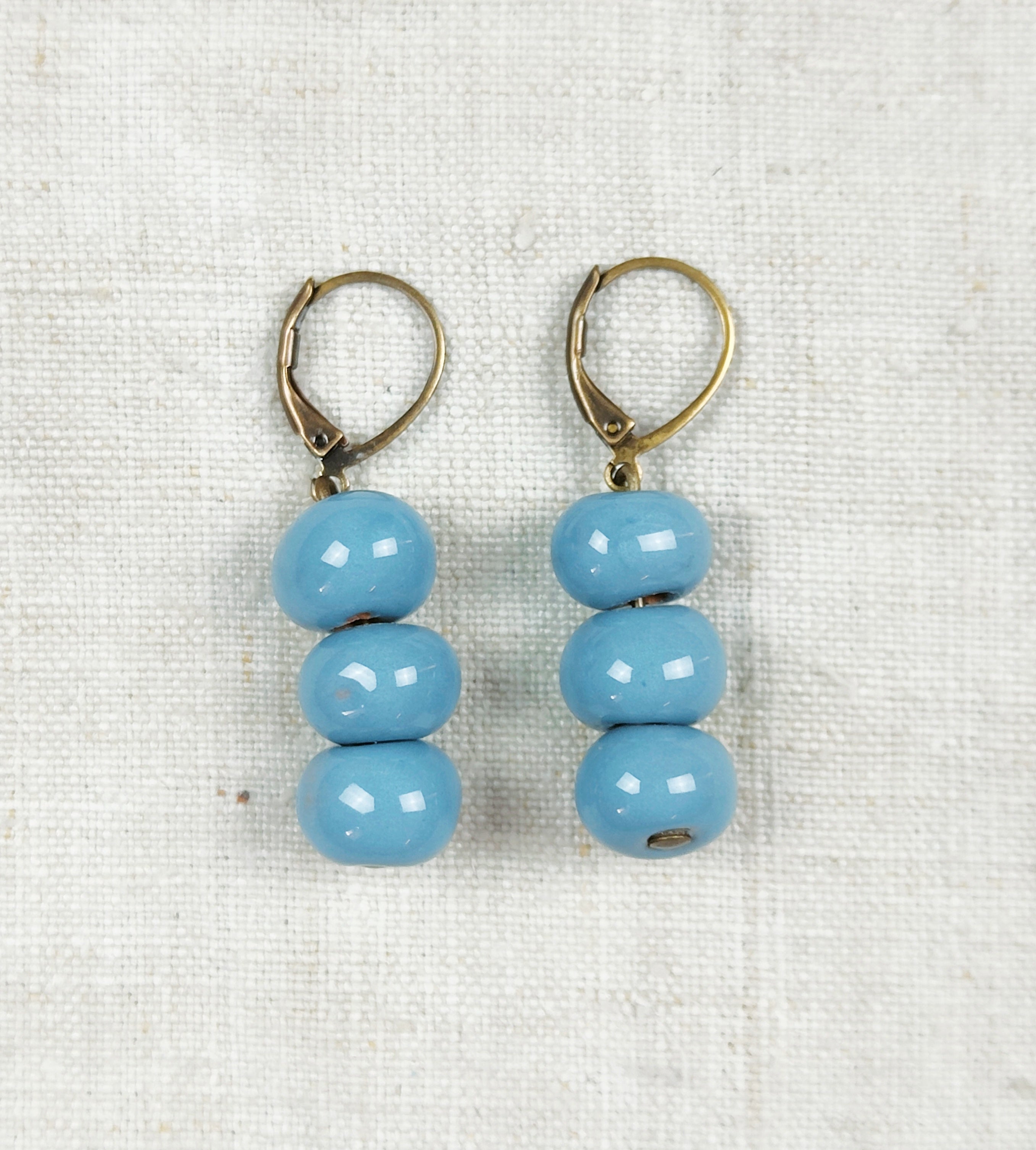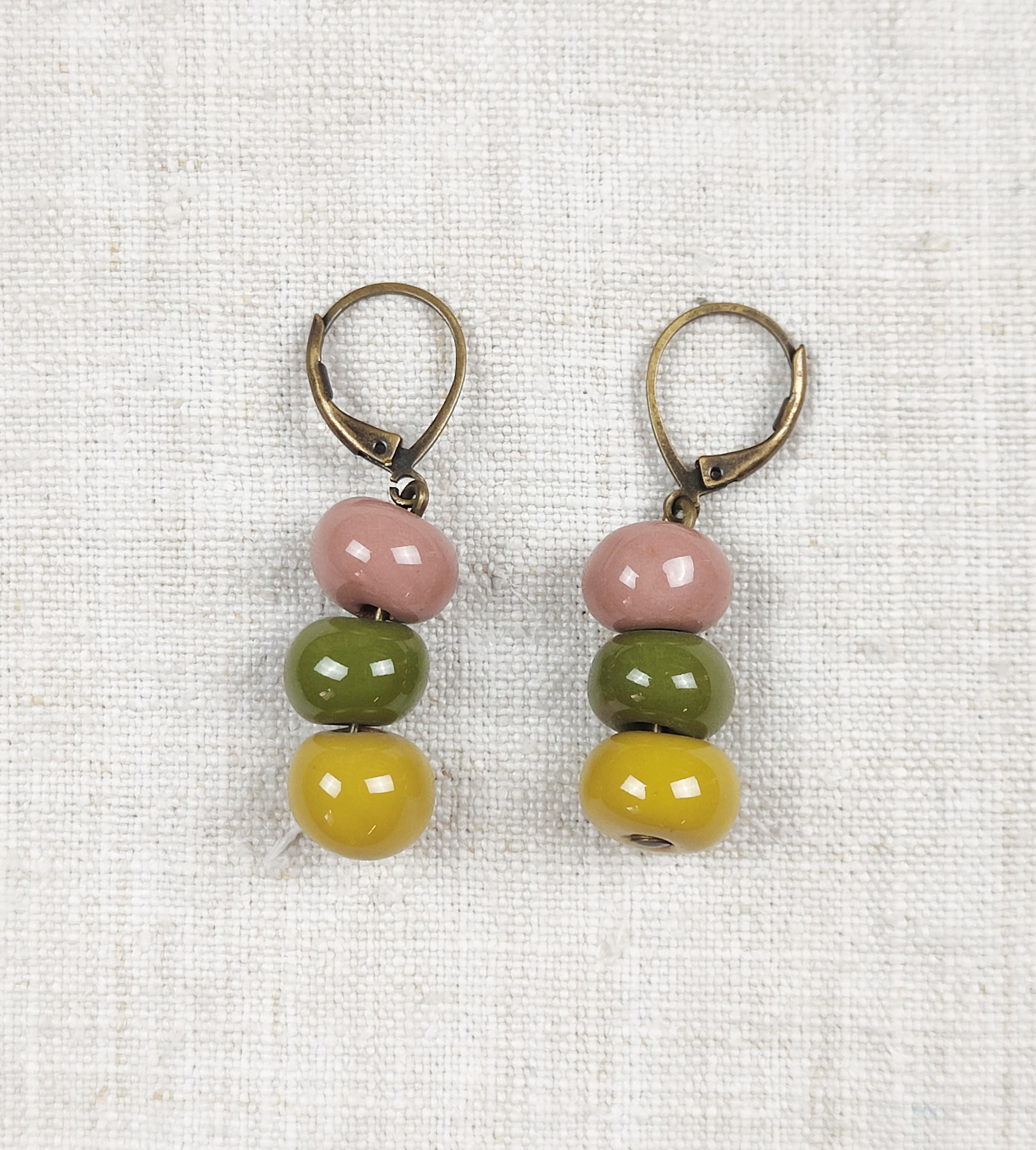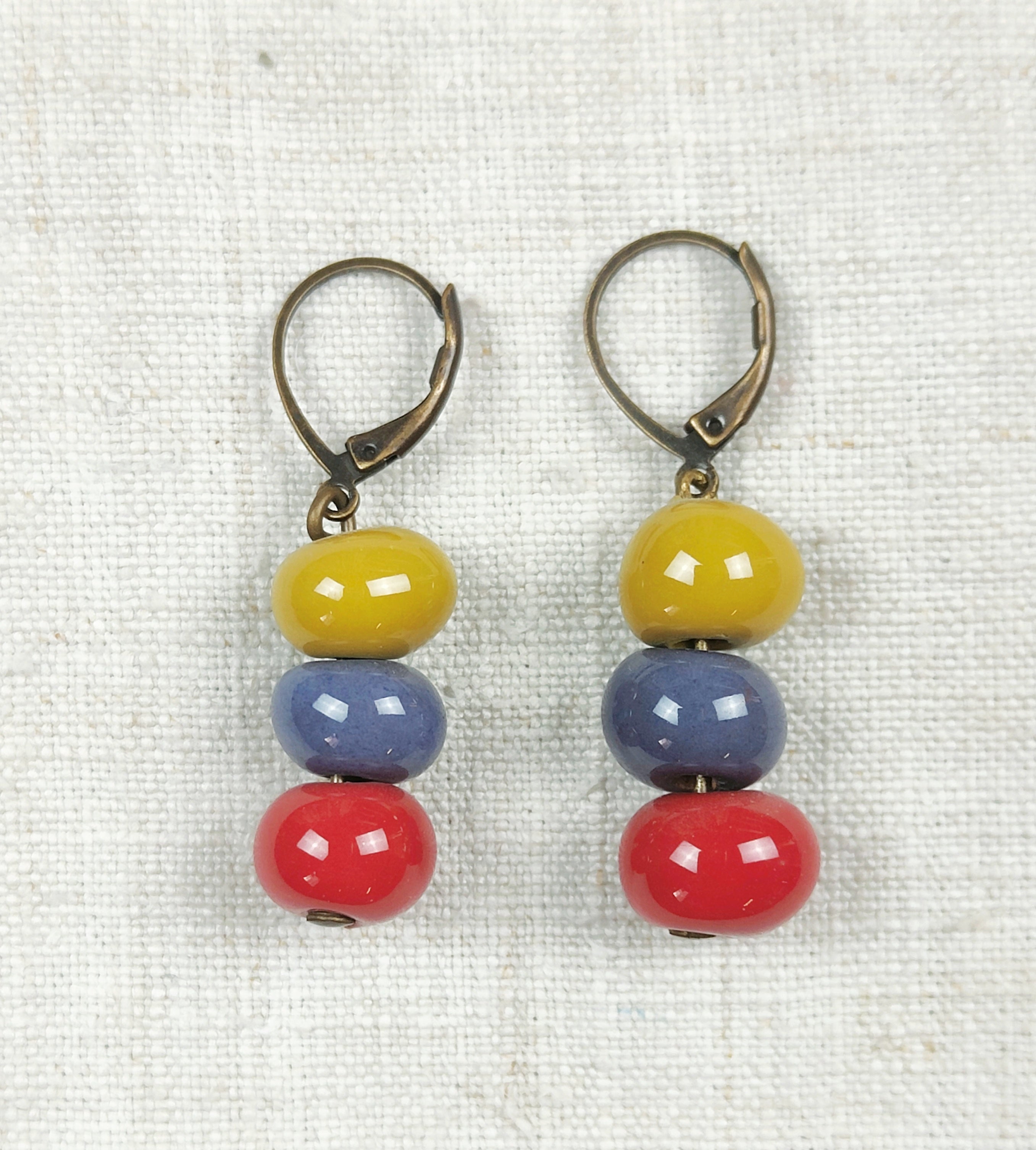 orecchini composti da tre boules di ceramica modellate e smaltate artigianalmente. La lunghezza totale è di cm 3,5