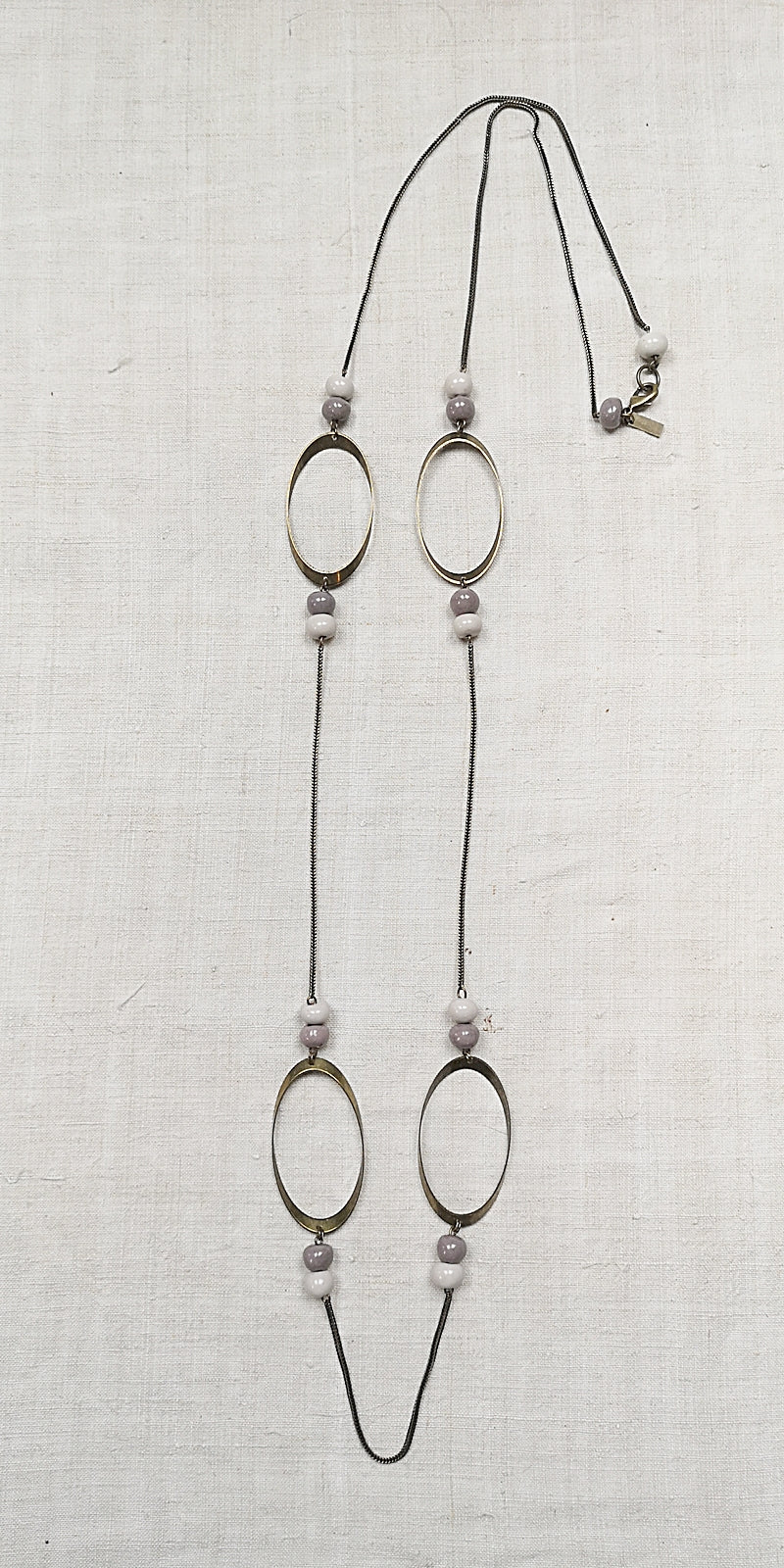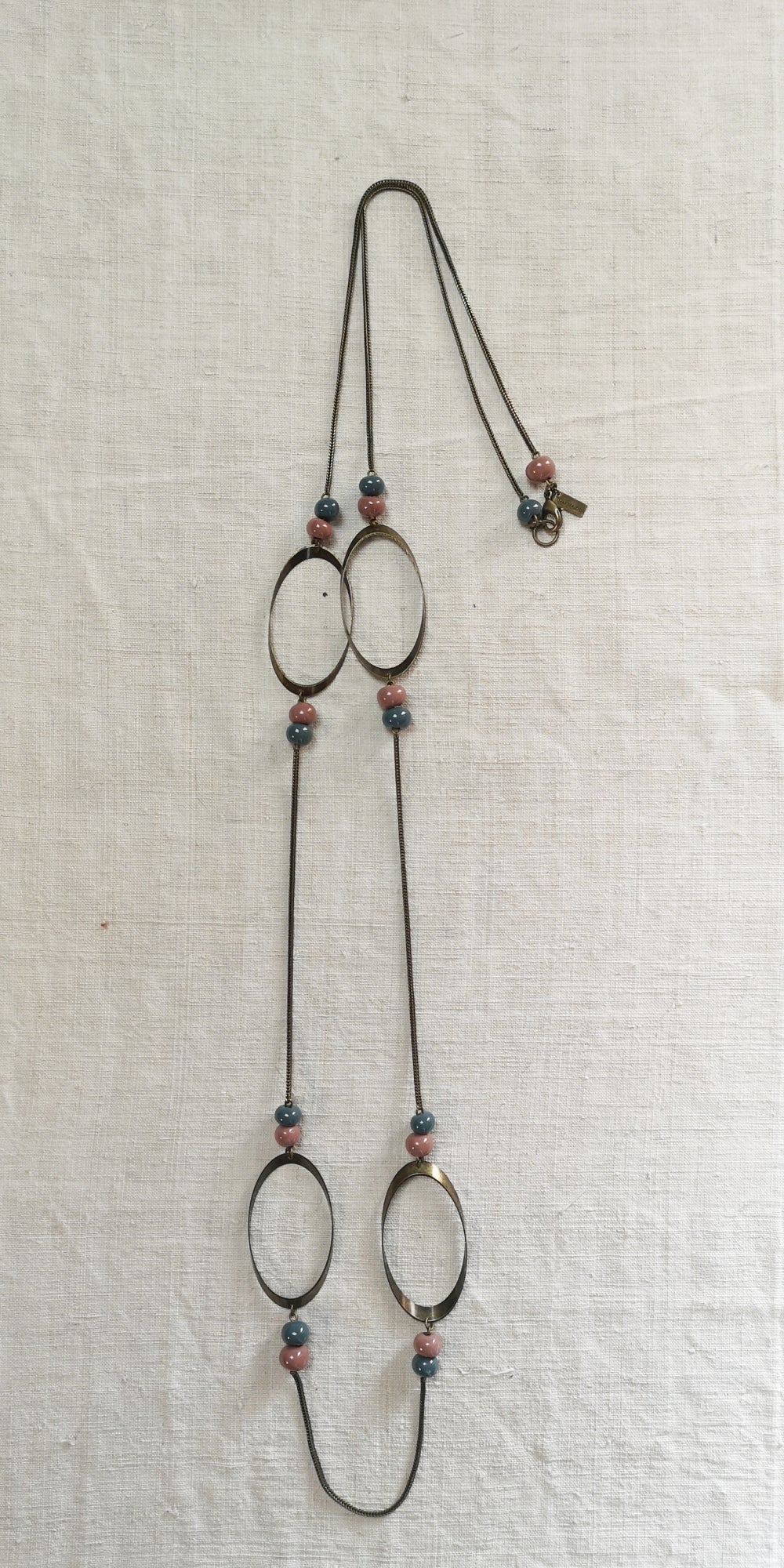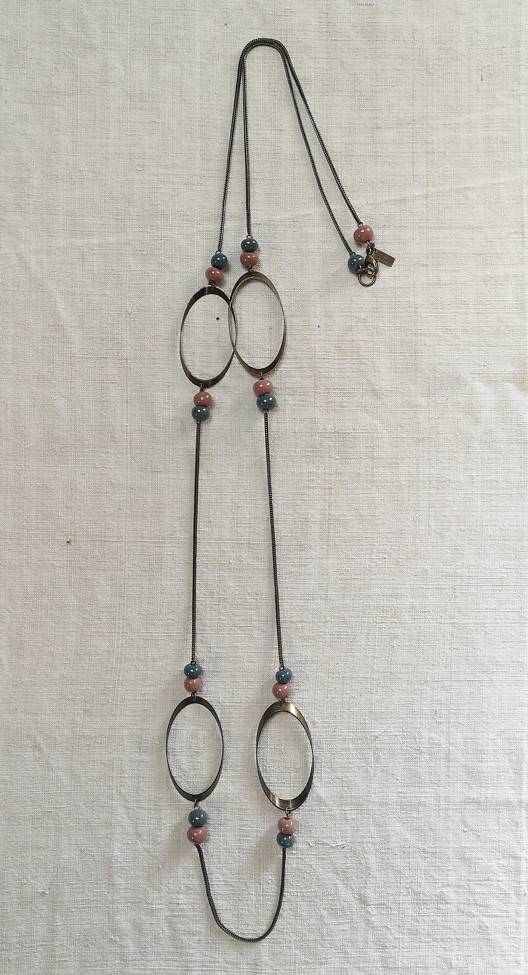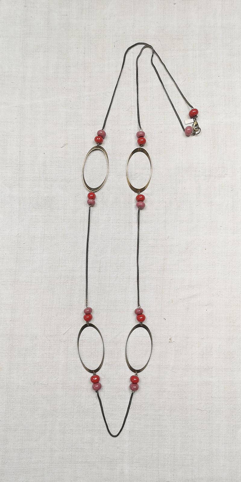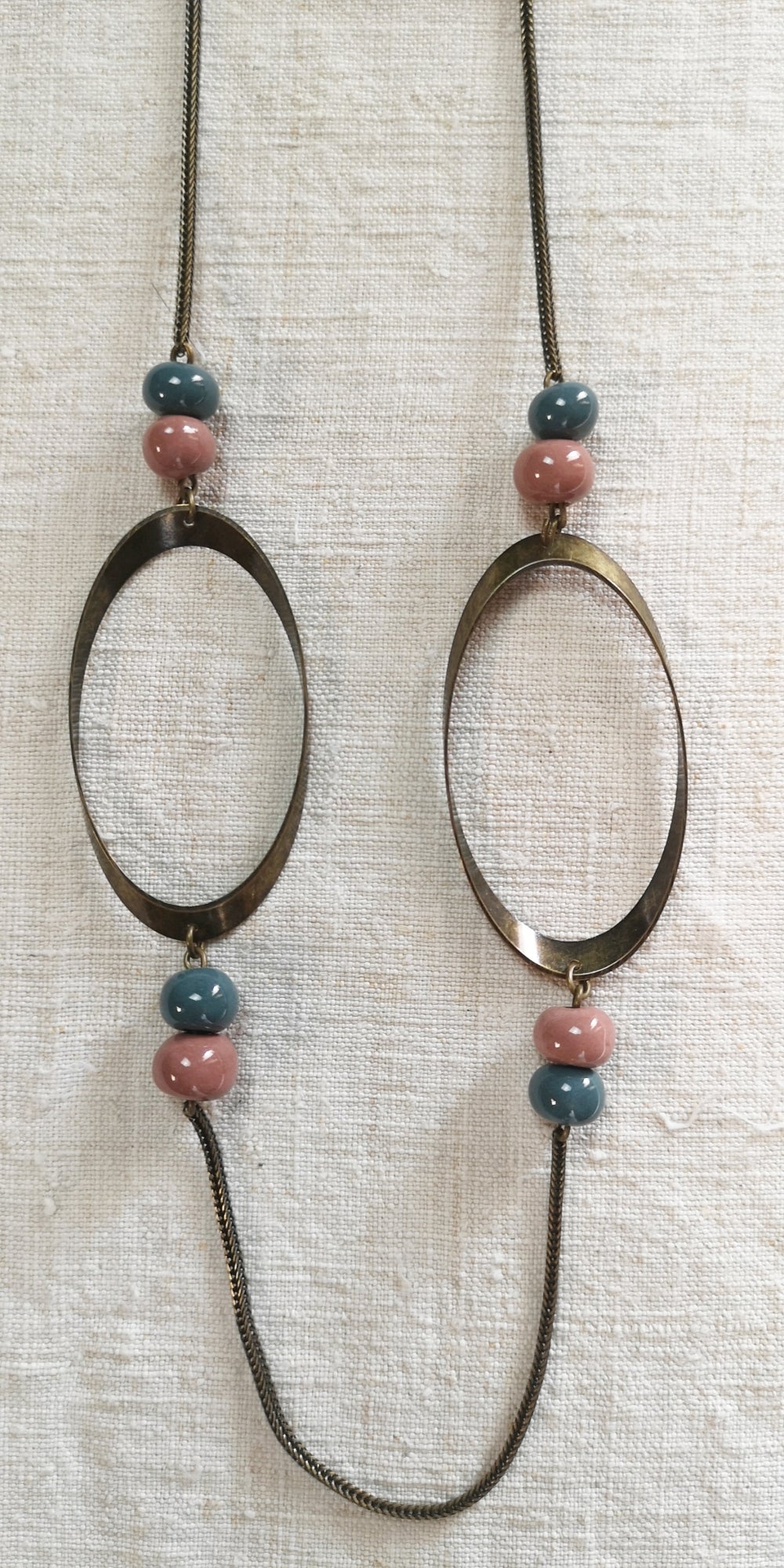 Collana in ottone invecchiato senza nichel con anelli ovali e boules in ceramica bicolore modellate e smaltate manualmente.